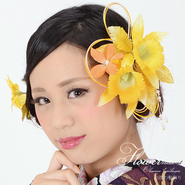 【カラー】コーム髪飾りは、黄色、オレンジ色のお花に、金色、黄色の紐飾り、白色のパールビーズワイヤー飾り。Uピン飾りは、黄色のお花。