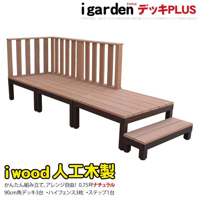 ウッドデッキPLUS 0.75坪 7点セット ナチュラル デッキ本体3点 ハイフェンス3点 ステップ1点 人工木床板 アルミ合金ボディ高さ4cm調節可能 アイウッドデッキPLUS 色あせない 腐らない シロアリ防止 床面ザラザラ加工 リアルな木質感