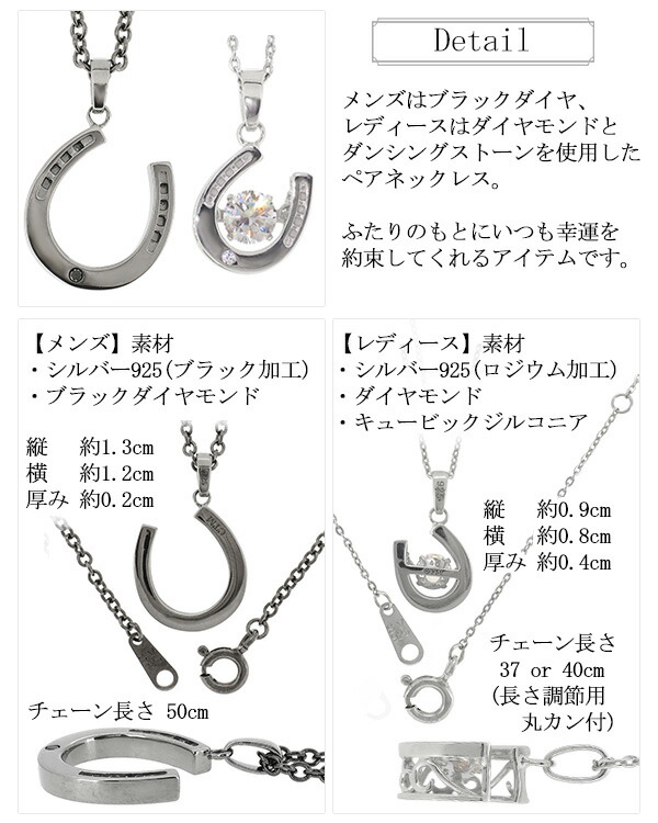メンズはブラックダイヤモンド、レディースはダイヤモンドとダンシングストーンを留めた、ホースシュー(馬蹄)のペアネックレスです。