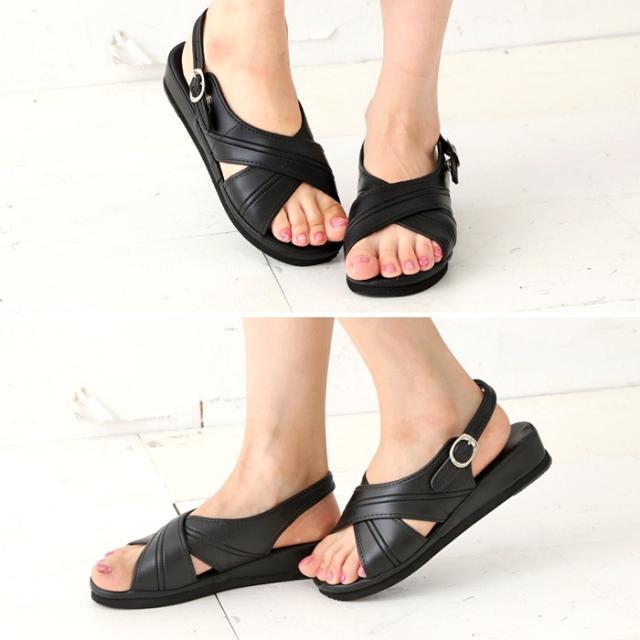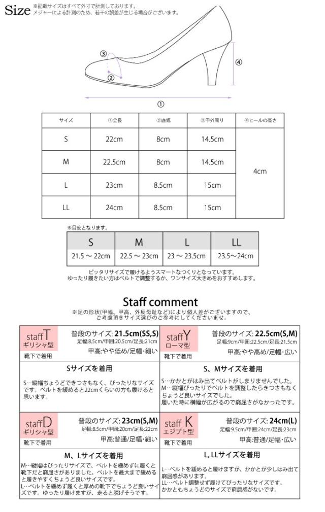 脚がすっきりと女性らしくきれいに見えるクロスデザイン ベルトはボタンで簡単に着脱でき、4段階のサイズ調節可能です。 高すぎず低すぎず、疲れにくい高さの4cmヒール インソールは歩行時の衝撃を軽減するクッション入りで快適な履き心地です。 ※ピッタリサイズで履けるよう小さめのつくりとなっており、横幅がタイトなデザインとなっております。 甲高&幅広さんやゆったり履きたい方はワンサイズ大きめをおすすめします。 ■サイズ ※カッコ内のサイズは目安となります。 S(21.5?22.0cm) M(22.5?23.0cm) L(23.0?23.5cm) LL(23.5?24.0cm) サイズ感につきましては当店スタッフの試着感想や、お客様からいただきましたレビューをご参考ください。 ■ヒール:(約)4cm ■素材:合成皮革 <お客様へ> 輸送中における靴箱のダメージは保証の範囲外となりますのでご了承くださいませ。 <商品カラーについて> モデル着用写真は屋内外での撮影の為、光の影響で実際のカラーとは異なる場合がございます。 カラーバリエーションの画像が実物に最も近いお色味です。そちらをご参考ください。[1612] |