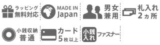 | 備考 | 【メイン開閉】ホック 外側/ ファスナーポケット×1 Dカン×1 内側/ 小銭入れ×1 札入れ×2 カードポケット×8 | ||