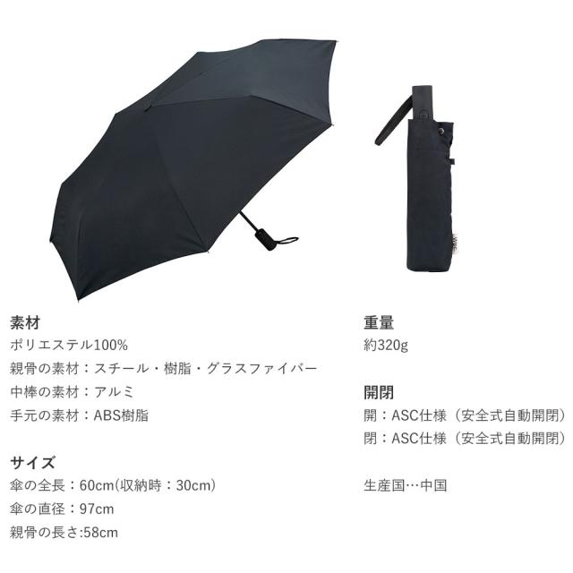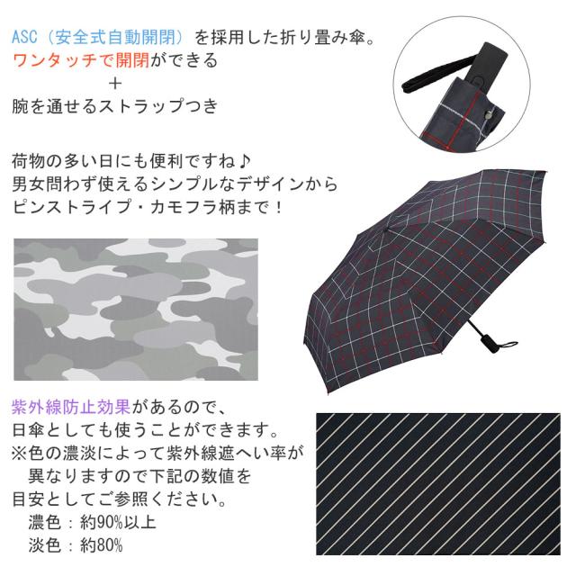 ASC(安全式自動開閉)を採用した折り畳み傘。ワンタッチで開閉ができるので荷物の多い日に便利♪腕を通せるストラップつき。