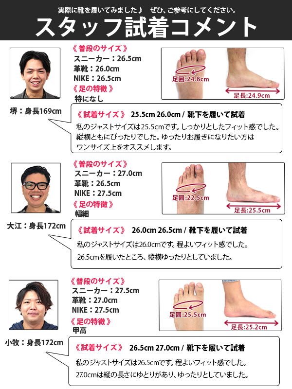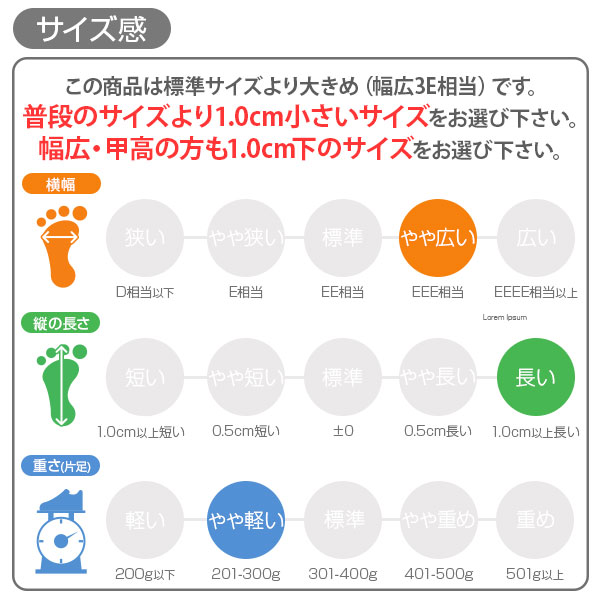 | こちらの商品は【標準サイズより大きめ(幅広3E相当)】です。 普段お履きのサイズより1cm小さいサイズをお選び下さい。 幅広設計なので、甲高・幅広の方も1cm小さいサイズをお選び下さい。 【男性スタッフKEN(169cm) 普段のサイズは、革靴26cm/日本製スニーカー26.5cmです】 私のジャストサイズは25.5cmでした。靴下を履いて、ゆったりとしたフィット感のあるサイズです。 納期について 当商品は入金確認後、平日1〜3日以内に発送される商品です。 ご了承くださいませ。 |