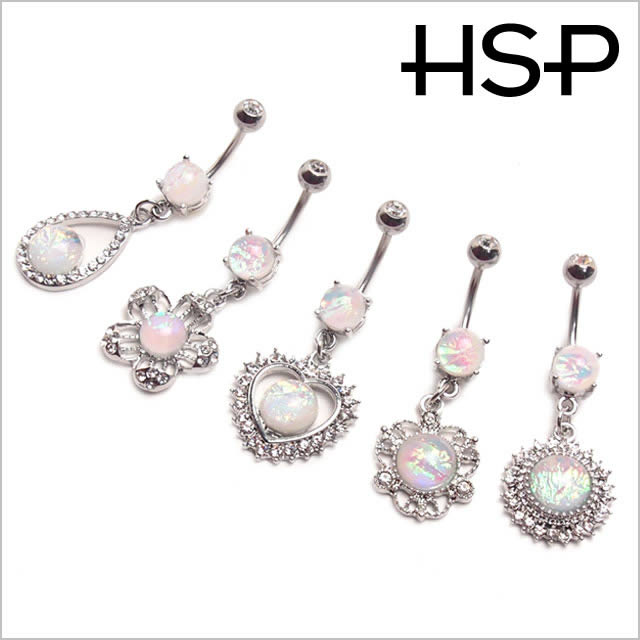ハート、フラワー(お花)、ティアドロップなど可愛らしいモチーフが揃ったへそピアス(バナナバーベル)。