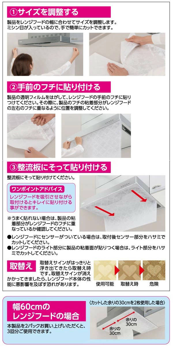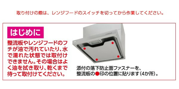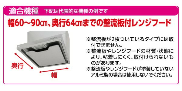 | 注意事項 | ※整流板が2枚付いているタイプには取付できません ※整流板やレンジフードが塗装されていないアルミ製の場合は使用しないでください ※整流板やレンジフードの材質・状態により、粘着しにくく、取付けられないものがあります |