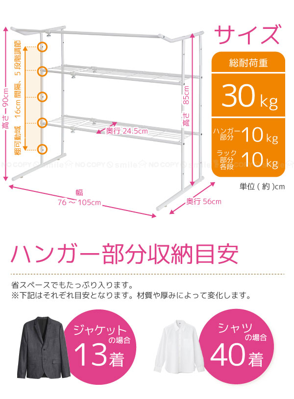 (約)30kg(棚1段当り10kg×2/ハンガー部10kg)