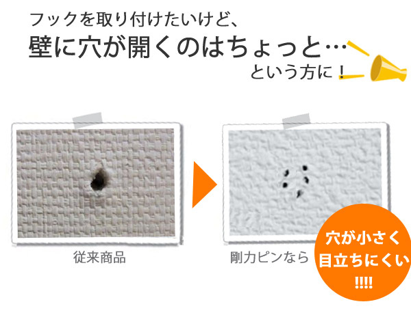 ![]() ![]() 穴跡が目立ちにくい 従来の木ネジを使用すると、壁に大きな穴があき、大切なお家の壁が台無しになっていましたが、剛力ピンなら5本の細いピンで固定するので穴が目立ちにくく安心です。 ![]() 画びょう感覚でクイッと押すだけの簡単設置 取り付けは簡単!画びょう感覚でクイッと押すだけ。5本のピンがしっかりクロスして壁をキャッチ!だから細いピンでも安全荷重16kgを実現しました!! ランドセルや重い工具などの重量物も安心して掛けることが出来ますね♪ ![]() ![]() ![]() ![]() |