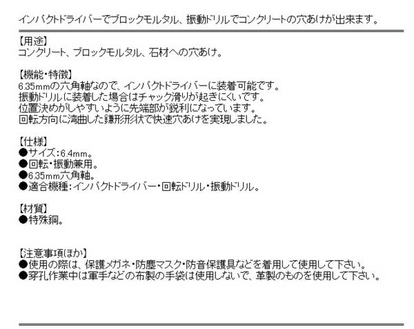 コンクリートドリル 6.4MM 穴あけ コンクリート ブロック インパクトドライバー 振動ドリル