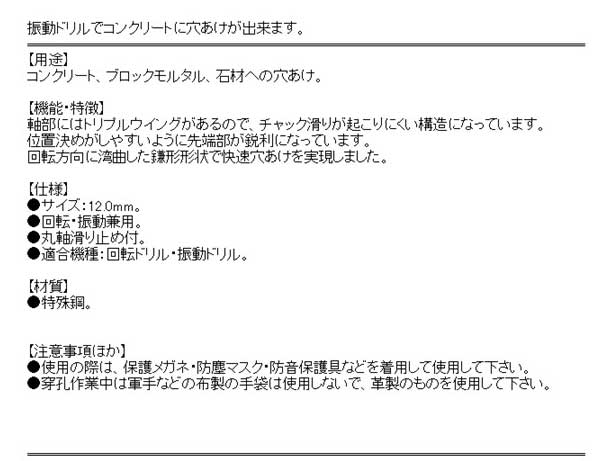 コンクリートドリル 12.0MM 穴あけ コンクリート ブロック 振動ドリル