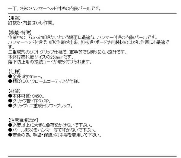 作業中の、ちょっと叩きたいという場面に最適な、ハンマー付きの内装バールです。