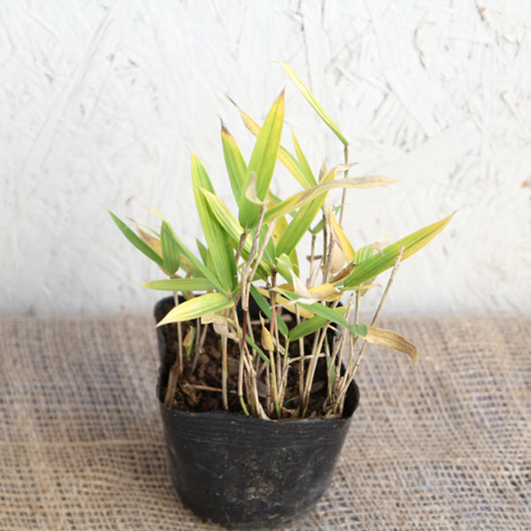 カムロザサはメダケの仲間で、黄色斑に多数の緑条が入る鮮やかな新葉が魅力です。 その鮮やかな葉色から黄金笹(オウゴンザサ)とも呼ばれます。 高さは20〜40cmほどなので、庭園の下草や寄せ植えによく利用されています。 和風庭園はもちろん、洋風やモダン風にも似合います。 夏を過ぎると斑の色は薄れてしまいますが、季節の移り変わりをお庭で楽しめます。 |