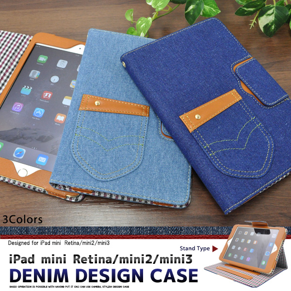 デニムデザインのiPad mini Retina/iPad mini2/mini3用スタンドケースポーチ。