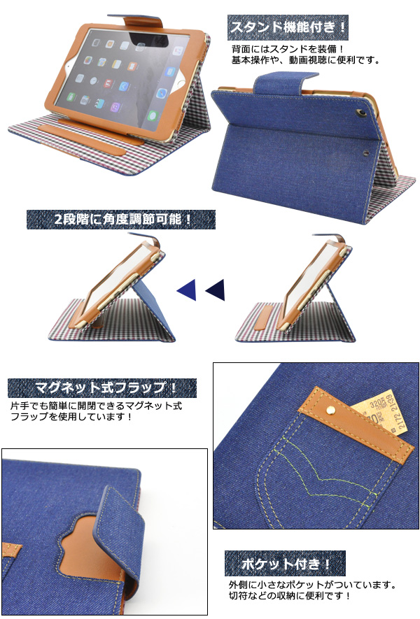 iPad mini2 iPad mini Retina iPad mini3用 デニムデザインケース 手帳型 iPadmini mini2用 保護ケース 保護カバー iPadケース タブレットケース カバー