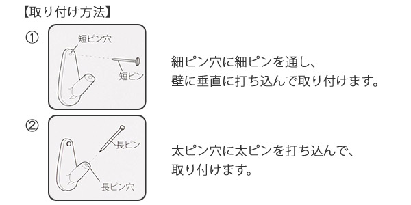 ![]() ![]() 時計を壁にピッタリかけることが出来る スリムな形状で、時計を壁にピッタリ掛けることが出来ます。また、フック部分にくびれがあるので、掛けたものが外れにくい仕組みになっています。 ![]() カナヅチを使って簡単設置 石こうボード壁・木壁等にカナヅチなどを使用して、短ピンと長ピンの2本で固定して設置してください。 安全荷重は石こうボード壁に設置した場合3kg、木壁に設置した場合6kgです。 ![]() ![]() |
