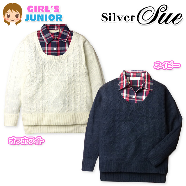 子供服 女の子 プルオーバー 長袖 Silver Sue ケーブルニット 重ね着風 シャツ切替 洗濯洗いOK 女児 ジュニア