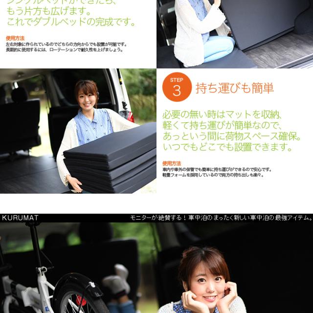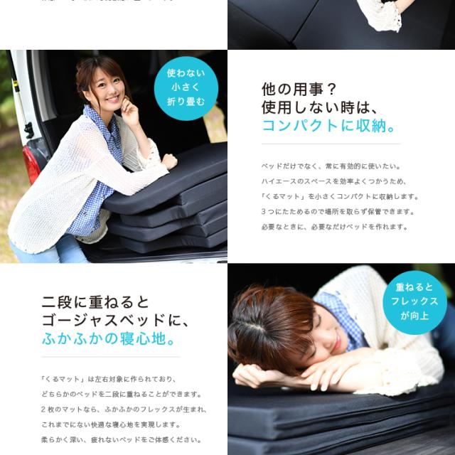 ★200系専用の簡単ベット"くるマット"登場!車中泊でベッドとして大活躍します!汎用品とは違って室内をもてあますことなく最大限のベッドが完成します。3つおりで女性や子供でも簡単に設置できます。キャンプ、海、サーフィン、スノボ、スキーに大活躍です!