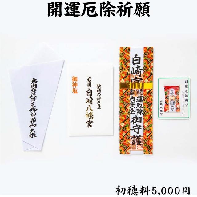お申込みをいただいた後、大安の佳き日に白崎八幡宮のご神前にて、白崎八幡宮のご祭神であらせられる應神天皇・神功皇后・仲哀天皇をはじめとし、境内末社の猿田彦神社に鎮座する「みちびきの神さま猿田彦大神」及び劔神社に鎮座する「勝利の神さま武甕槌大神」のご神徳をお頒ちし、皆様の開運厄除祈願をご奉仕いたします。