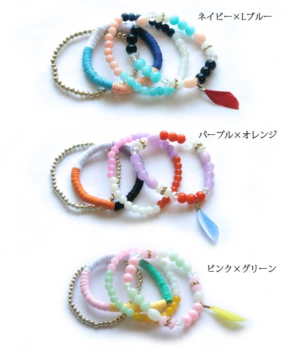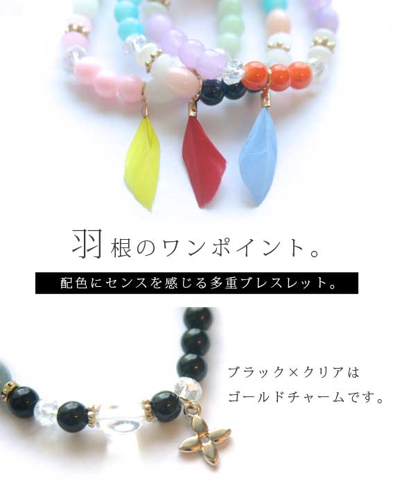 本日P2倍 ブレスレット 羽根・チャームと天然石風 ビーズ 4連 カラー 多重セット レディース ブレス