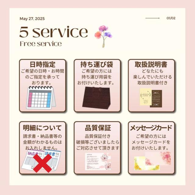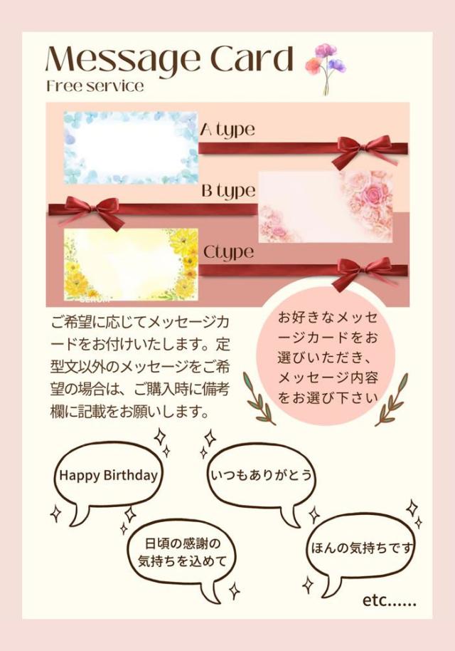 ご希望の方には、メッセージカード、ラッピング、手提げ袋をサービス致します。備考欄にメッセージを50文字以内でお書きください。