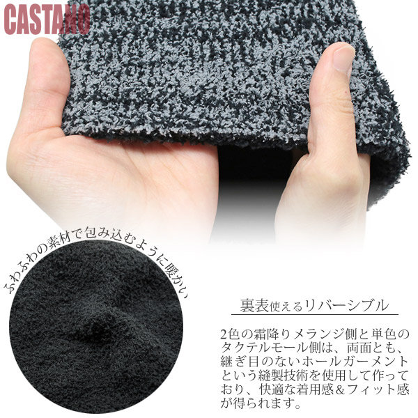 2色の霜降りメランジ側と単色のタクテルモール側は、両面とも、継ぎ目のないホールガーメントという縫製技術を使用して作っており、快適な着用感&フィット感が得られます。着用すると分かる病みつきの肌触りの良さは1度ご使用になると実感できると思います。カジュアルに落とし込みやすいゆったりしたサイズ感なので、メンズでもレディースでも性別に関係なくご利用していただけるユニセックスアイテム!冬の防寒対策に家族で一緒にご利用も出来ちゃいますよ♪また、リバーシブルタイプのニット帽となっていますので、その日のコーデに合わせて表裏2パターンを楽しむことができます。