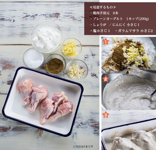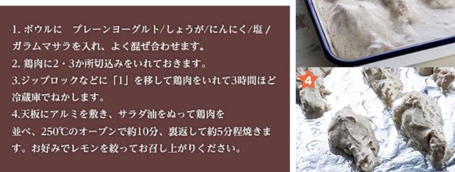 本体裏面に「かんたんタンドリーチキン」レシピがついています。レシピを参考にお試しくださいませ。