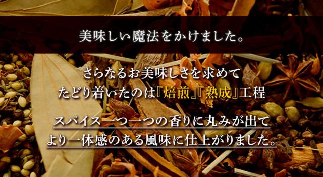 より上の美味しさを目指してたどり着いたのは『焙煎』『熟成』行程。スパイスの1つ1つの香りに丸みが出て、