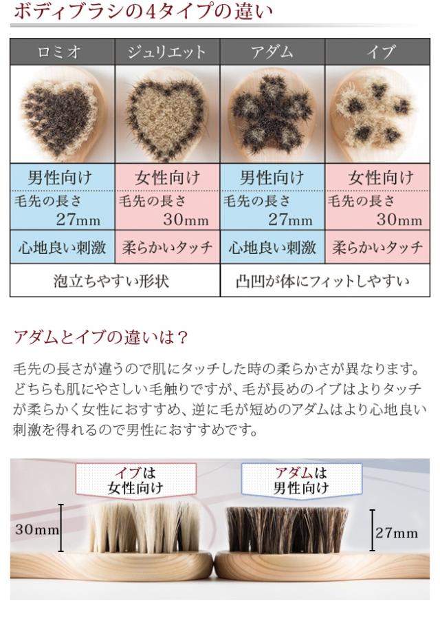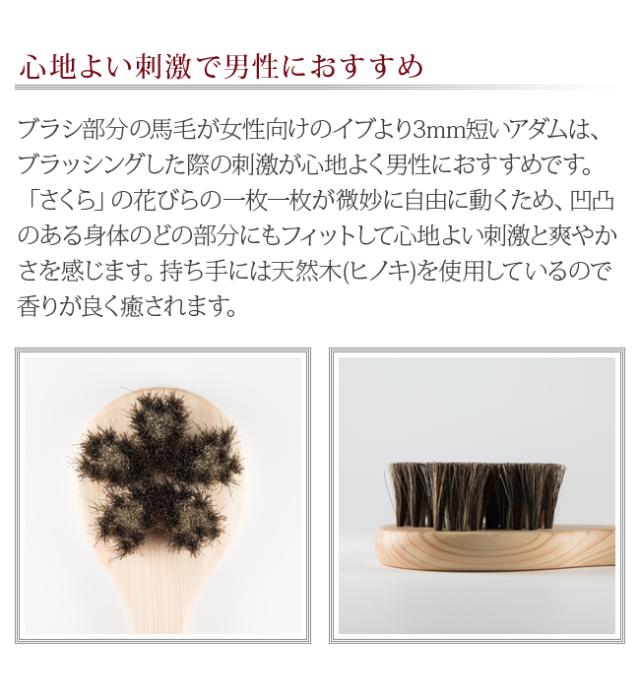 馬毛ボディブラシ・さくら「アダム」。心地よい刺激で男性におすすめ。ブラシ部分の馬毛が女性向けのイブより3mm短いアダムはブラッシングした際の刺激が心地よく、男性におすすめ。桜の花びらの一枚一枚が微妙に自由に動くため、凹凸のある体のどの部分にもフィットして心地よい刺激と爽やかさを感じます。持ち手は天然木(ヒノキ)なので香りが良く癒されます。お手入れに便利なブラシクリーナー付き。