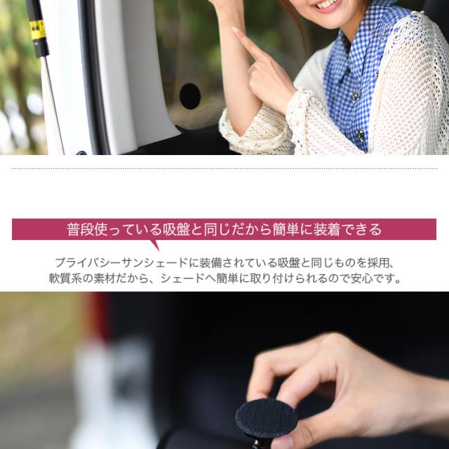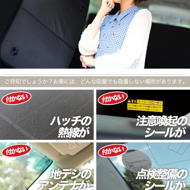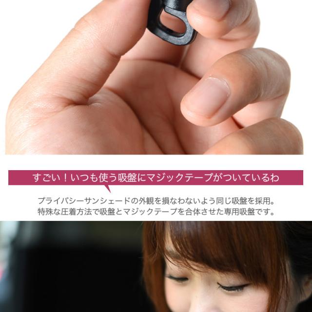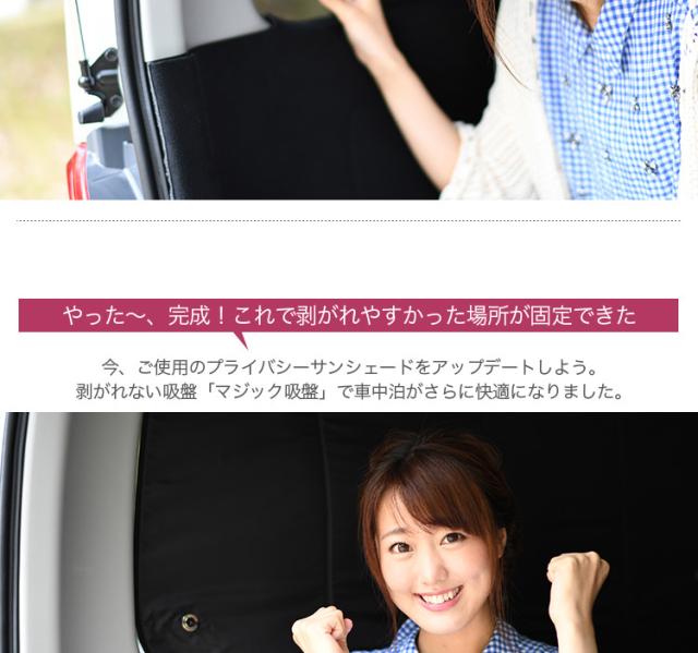 「プライバシーサンシェード」を装着の際、リアハッチの熱線、点検シール、アンテナシール、クローザー注意シール等、吸盤の吸着の妨げになる場所にマジックテープの凹面を接着し、マジック吸盤に付け替えるだけで「剥がれない吸盤」としてご活用いただけます。多くのお客様の声から生まれたまったく新しい「マジック吸盤」でサンシェードをアップグレードし車中泊を楽しみましょう!