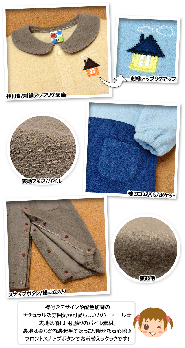 【送料無料】ベビー服 女の子 カバーオール 長袖 パイル 裏起毛 衿付き 刺繍アップリケ 配色切替 スナップボタン 女児 ベビー