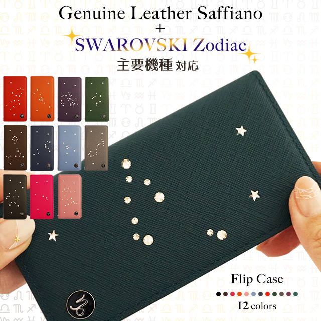 スタイリッシュでハイクオリティな本革ケース(フリップタイプ)に12星座をスワロフスキーで散りばめた大人上品なフリップケース。左利き用もご用意しました。ケースカラーと星座をそれぞれお選びください。