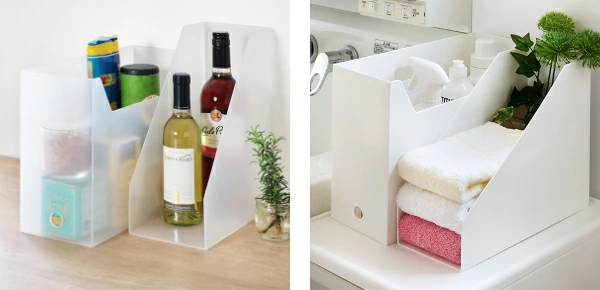 シンク下などキッチン周りの整頓にも役立ちます。フライパン等の調理器具を立てて収納できるので、使いたい時にサッと取り出せてスムーズに料理が出来ます。調味料の定位置にしておくと万が一こぼれても、ボックスに入れておけばサッと拭くだけなので安心です。