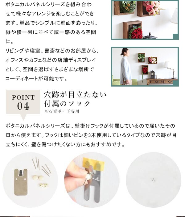 壁面への取り付けは取扱説明書をよくお読みの上、付属の壁掛け用フックをお使いください。付属のフックは石膏ボード壁専用です。またフック1個につき壁に押しピンを6本差し込んで固定するタイプです。パネルの落下により発生した損害に対して当店は一切責任を負いかねますので、十分ご検討の上ご使用いただきますようお願い申し上げます。
