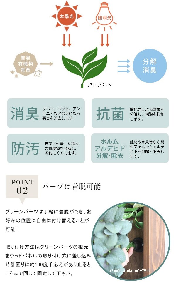 日本製/完成品/壁掛け用フック2個付属/ウッドパネル取り付け穴2個/グリーンパーツ2個付属/グリーンパーツは着脱・付け替え可能