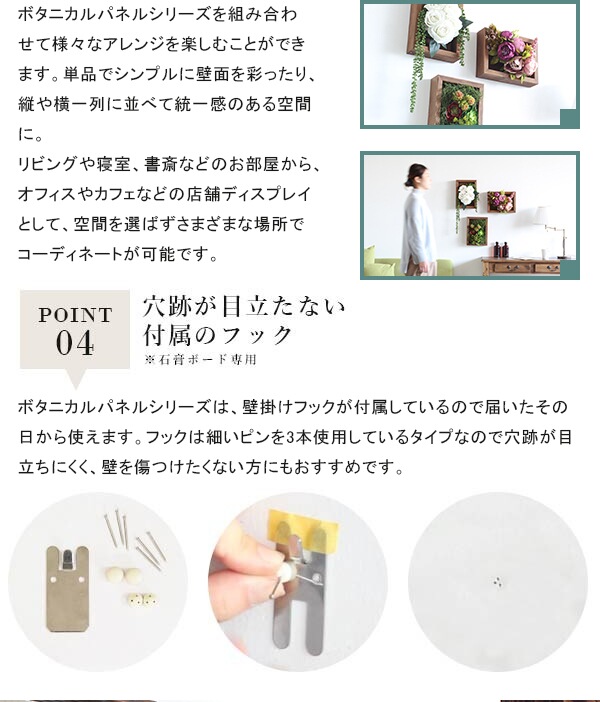 壁面への取り付けは取扱説明書をよくお読みの上、付属の壁掛け用フックをお使いください。付属のフックは石膏ボード壁専用です。またフック1個につき壁に押しピンを6本差し込んで固定するタイプです。パネルの落下により発生した損害に対して当店は一切責任を負いかねますので、十分ご検討の上ご使用いただきますようお願い申し上げます。