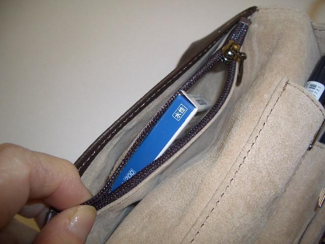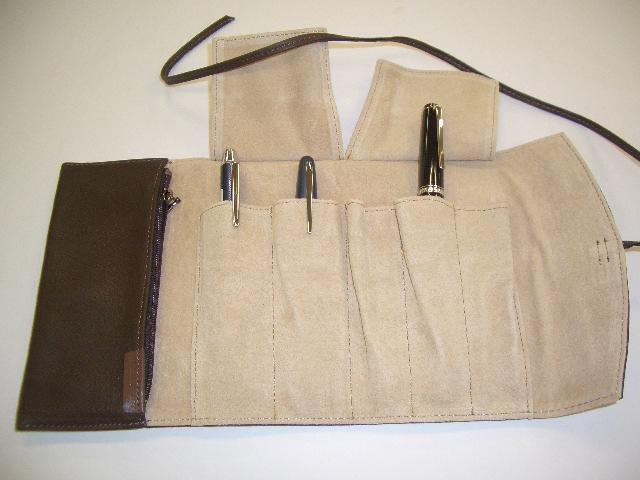 仕様:牛革、ピッグスウェード(内生地)、ペン差し5本、ファスナー付きポケット、カブセ蓋付、革紐巻き留め