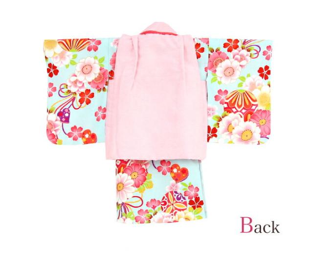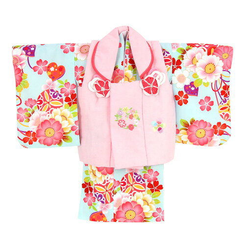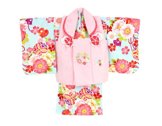 レンタル 女の子 1歳用着物レンタル 「水色地に八重桜とリボン(被布:ピンク)」