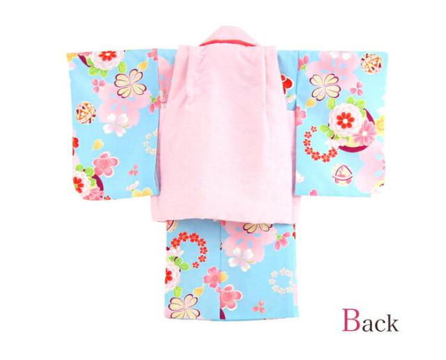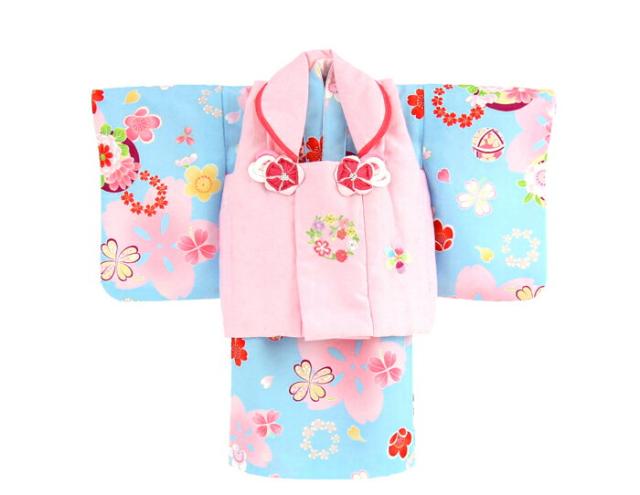 レンタル 女の子 1歳用着物レンタル 「水色地に小鞠・桜にクローバー(被布:ピンク)」