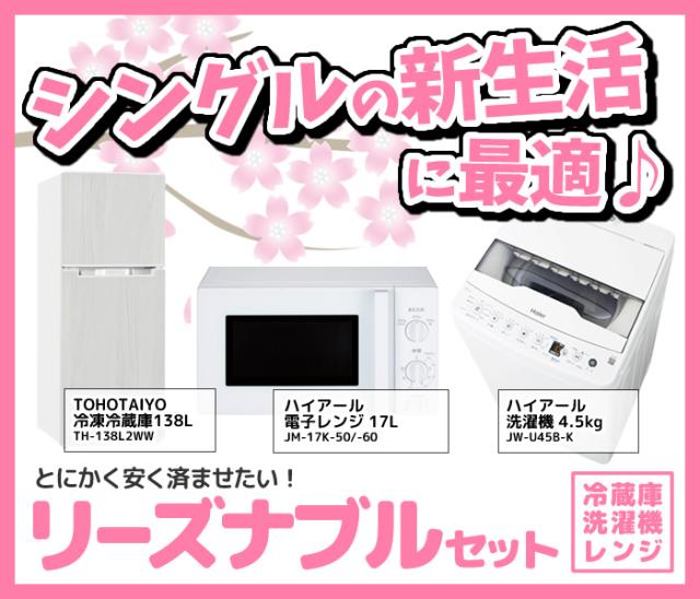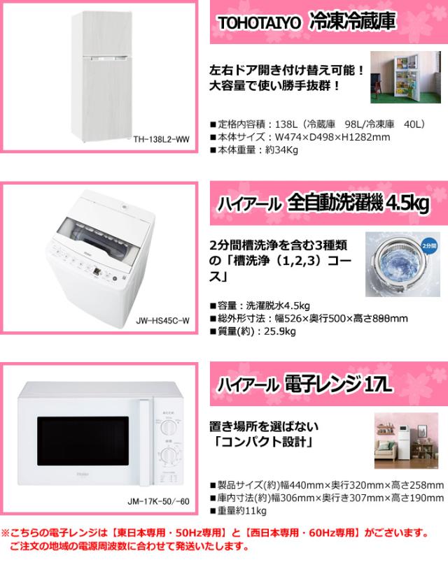 シングル・一人暮らし・新生活に最適♪ とにかく安く済ませたい! 冷蔵庫・洗濯機・レンジのリーズナブルセット! [冷蔵庫]TOHOTAIYO(TH-138L2-WW) [洗濯機]ハイアール (JW-HS45C-W) [レンジ]ハイアール(JM-17K-50/-60) ※記載は商品仕様の一部です。仕様説明不足等の理由での返品はできません。特に適合等は必ずご確認ください。