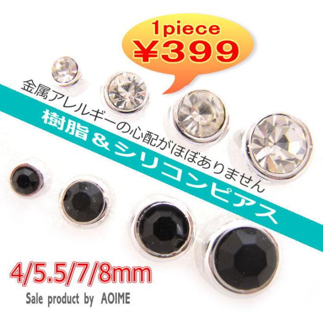シングルピアス 樹脂ピアス シリコンキャッチ ブラック クリア ラインストーンピアス4mm 5.5mm 7mm 8mm 片売り