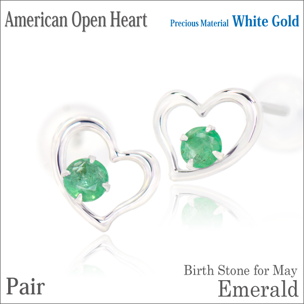 エメラルド ピアス 送料無料 K10 ホワイトゴールド アメリカンオープンハート 2.5mm スタッド 両耳ペア