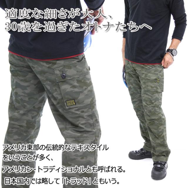 【中国産業 HOP-SCOT】ご覧の通りバリカッチョイイ迷彩柄のリップストップカーゴパンツです。かなりアウトドアテイストが満載のカーゴパンツです!遊び心満点の商品!作業ズボンやレジャー、アウトドアのシーンで大活躍!。■ダボ付かない細身シルエット■新鮮な迷彩柄のカーゴデザイン■素材 綿35%ポリエステル65%■オールシーズン素材■機能 リップストップ/カーゴポケット■程よいワタリ幅で作業性、耐久性でも持って来いのカーゴパンツです。アウトドアや作業服に最適!□サイズチャート【S寸】W76/股下83(誤差+−1cm)【M寸】W80/股下83(誤差+−1cm)【L寸】W84/股下83(誤差+−1cm)【LL寸】W88/股下83(誤差+−1cm)【3L寸】W92/股下83(誤差+−1cm)【4L寸】W98/股下81(誤差+−1cm)モニター環境により画像の色と現物の色が多少違って見えます。また、人気商品の為表示在庫と実際の在庫が違う事があります。ご了承ください。【入荷しました!】アウトドアに持って来いの迷彩カーゴ