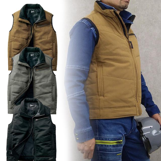 ワークウェアの上にも重ね着ができる防寒ベスト。