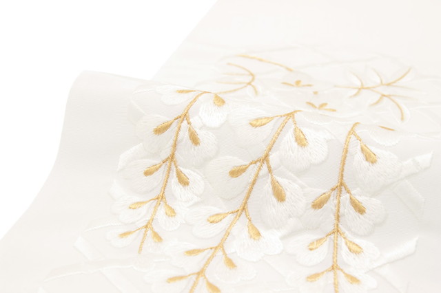 藤が咲き誇る藤棚が豪華に刺繍されている上品な柄ゆきです。