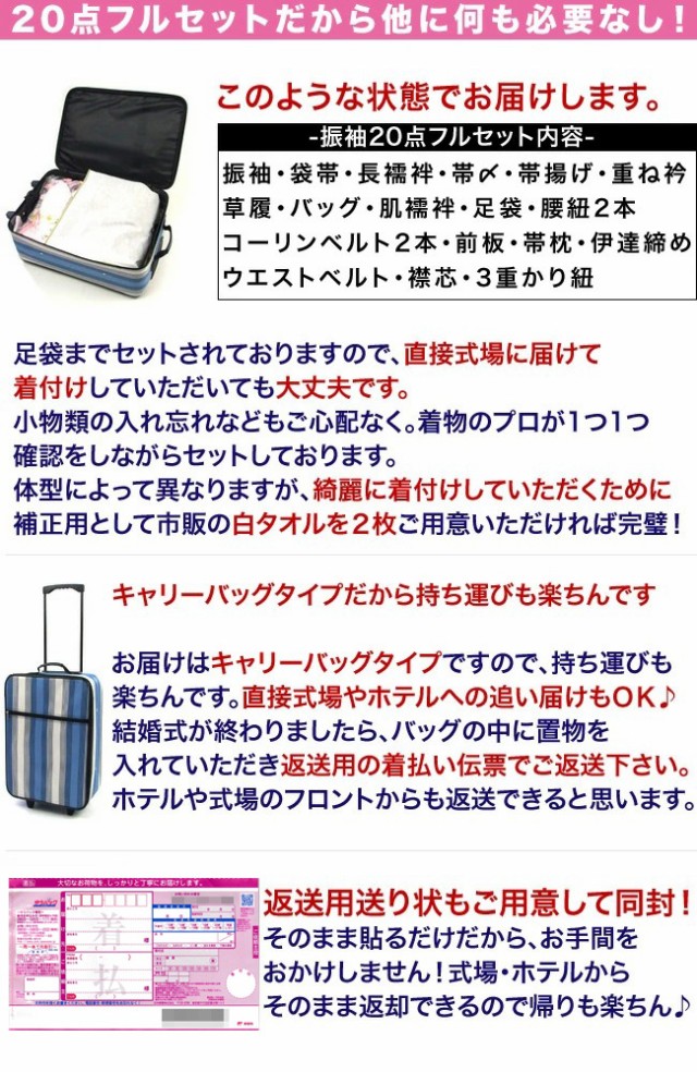 足袋まで揃った振袖レンタル20点フルセット。 素敵な振袖で成人式から結婚式までOK!-レンタル内容-- 振袖・袋帯・長襦袢・帯〆・帯揚げ・重ね衿・草履・バッグ肌襦袢・足袋・腰紐2本・コーリンベルト2本・前板帯枕・伊達締め ・ウエストベルト・襟芯・3重かり紐--素材--振袖・袋帯(ポリエステル100%) サイズ:身丈165cm・裄丈68cm・袖丈108cm対応サイズ:155cm〜168cm洋服サイズ:7号〜13号くらいまで
