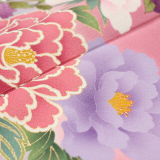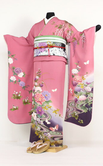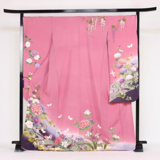 振袖 レンタル 正絹京友禅 20点フルセット 「ピンク 紫 パープル 牡丹 流水 藤の花 菊 蝶」2月〜12月上旬