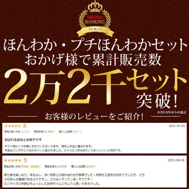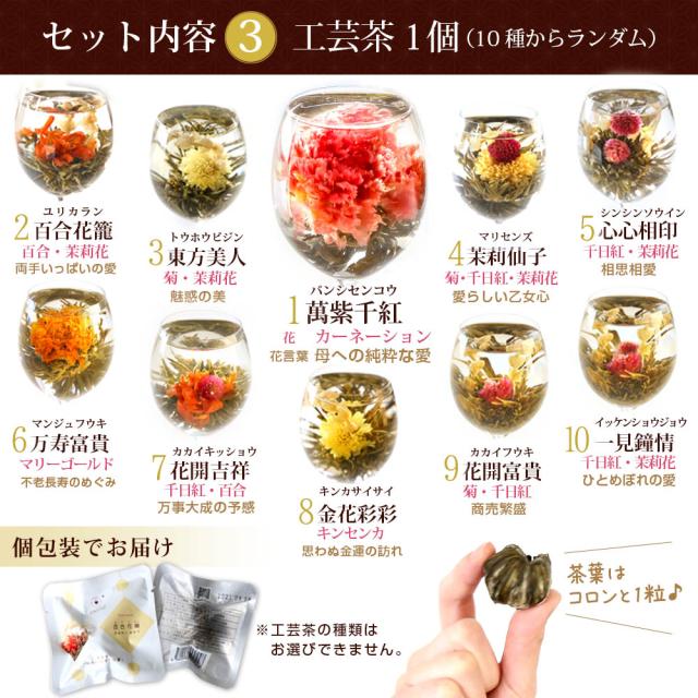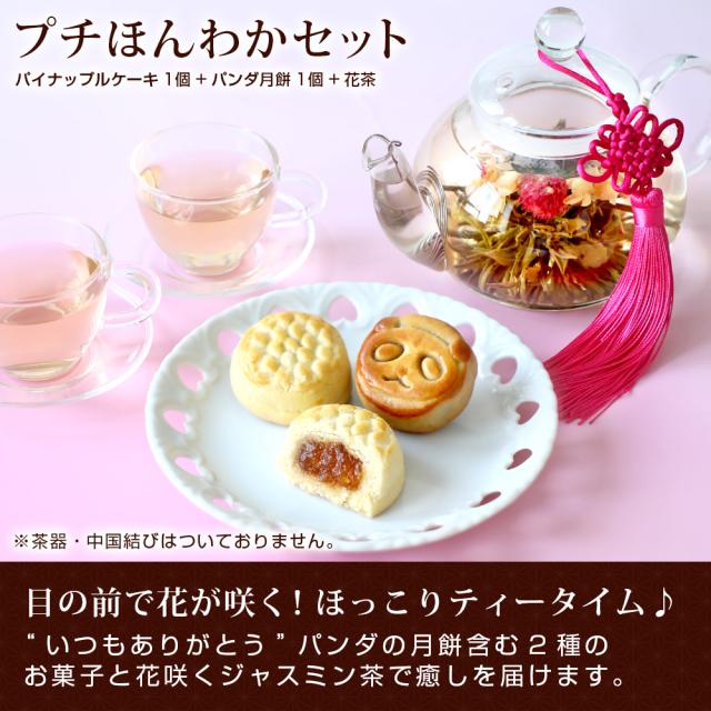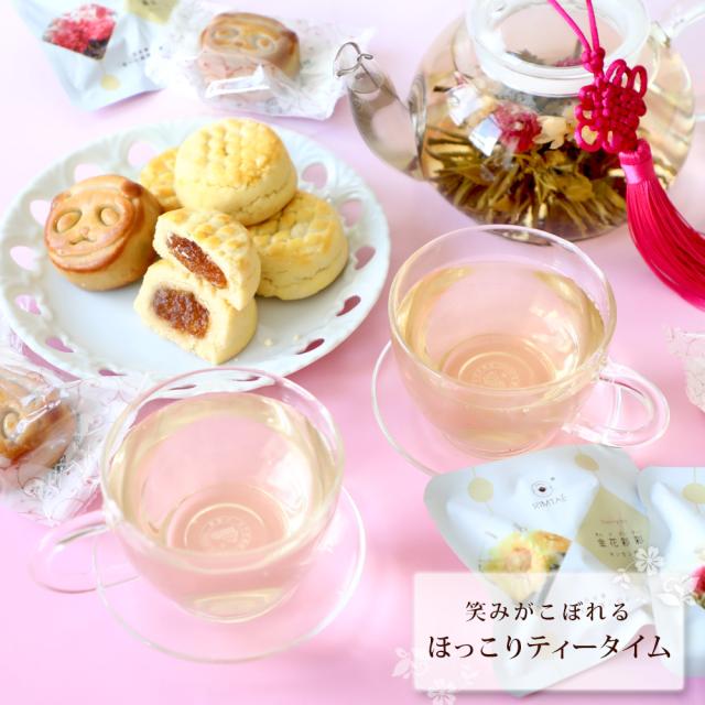 | 内 容 量 | ・花咲く工芸茶(10種のうちからランダムで) 1個・パンダ月餅1個・パイナップルケーキ 1個 ・お茶の淹れ方のしおり 1枚 |