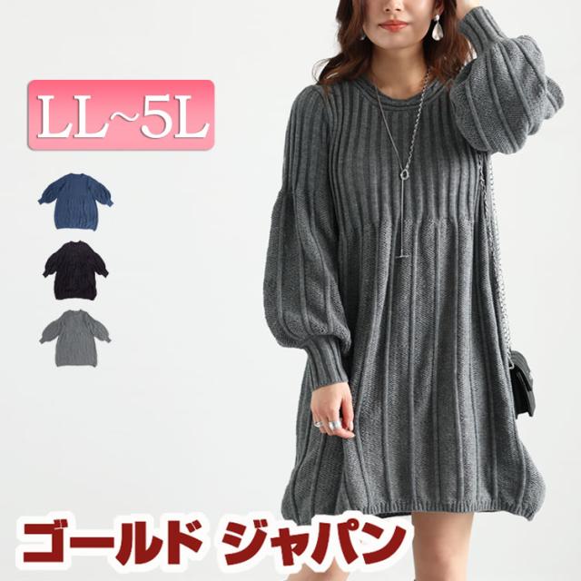 振り向くワンピ、リブ編み切り替えバルーンニット