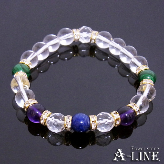 AAAラピスラズリ&AAAマラカイト&アメジスト&64面カットクリスタル&水晶8mm・合金ロンデル(金色と銀色の選択可)・国産高級オペロンゴム