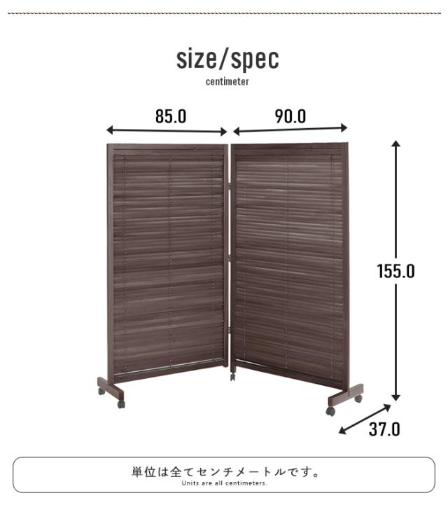 | [使用時] 幅85×奥行37×高さ155cm×1枚 幅90×奥行37×高さ155cm×1枚 [折りたたみ時] 幅90.5×高さ155×厚さ39.5cm [幕部] 幅78×高さ134cm 幅83×高さ134cm |