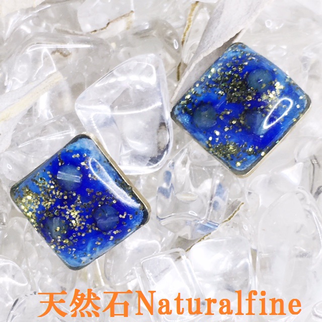 こちらのピアスは、天然石のアベンチュリンをレジン【樹脂】の中にいれ、背景に濃いめのブルーと白を基調にした中に、ゴールド色のラメを入れました!